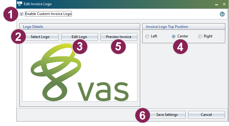- Select a position for the logo at the top of your invoice: Left, Center, or Right.