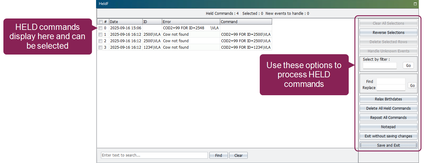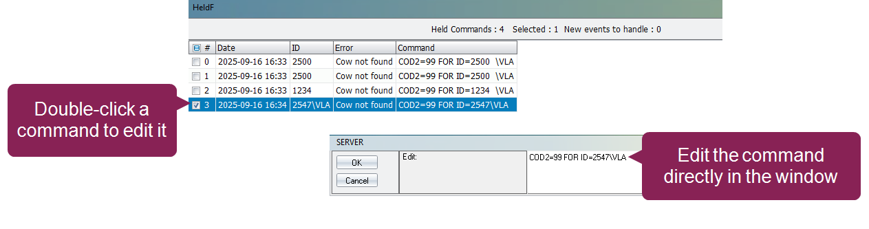 DC305 processes many types of commands—typed in by you, sent from other systems, or generated automatically. When a command fails, for example because an animal ID does not exist, an event name is unknown, or a birth date does not match, it is stored as a HELD command. The command is saved together with an error message so you know what went wrong. This prevents incomplete data from being lost or silently corrupting your records.