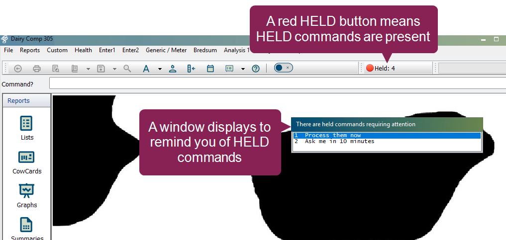 Answer: HELD commands are transactions that could not be processed because of an error. Instead of being discarded, they are saved for review so you can correct them and keep your herd records accurate. HELD commands must have their errors resolved so they can be reposted and entered into the cowfile.