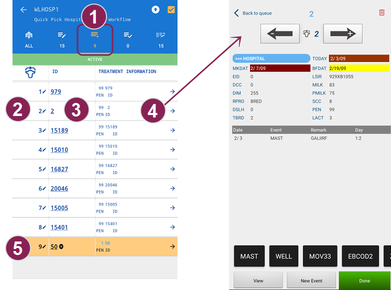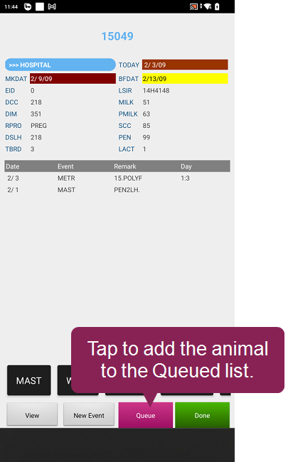 After you add animals to the queue, you can view, edit, or process them on the Queue list screen. Long press any icon to see what it does.