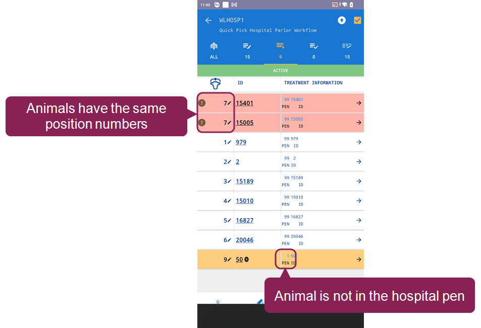 - Not in the hospital pen: Animals that are queued, but not included in the hospital list are highlighted.