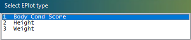 EPLOT differs from standard graphing commands because it plots the numeric value found in the Remark field of a specified event (for example, the body condition score recorded in the BCS event). Don't confuse EPLOT with the GRAPH or EGRAPH functions: