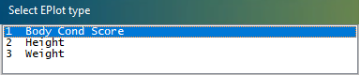 - y-axis: Displays the measurement value (for example, Score for BCS, Height, or Weight). The range is set in the EPLOT Settings (EPLOT\M).