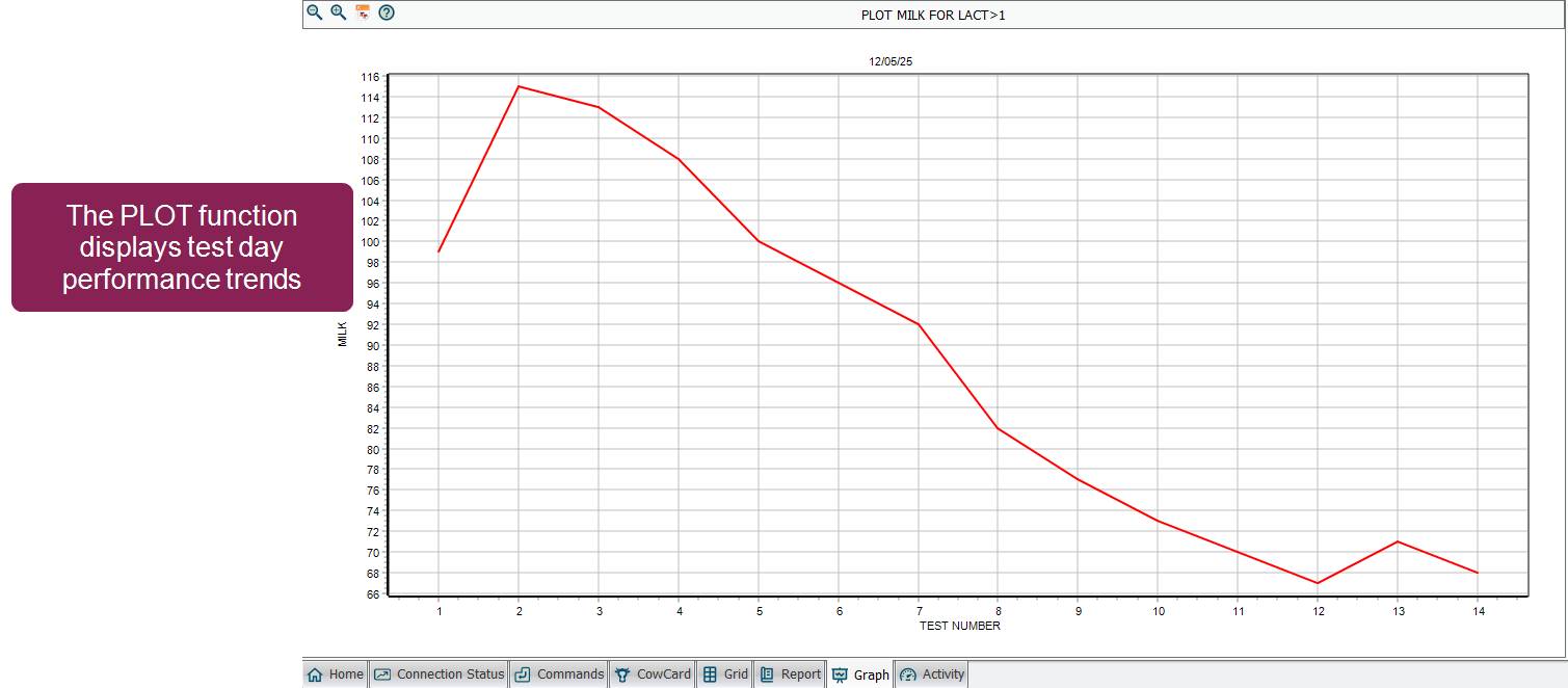 PLOT lets you display one or more numeric items (such as milk production or fat percentage) as curves on a graph or as raw data tables. You can also compare two groups on the same graph or break down results by categories like lactation group, cow breed, or test day pen. This function is helpful for analyzing production patterns, monitoring herd performance, and benchmarking different animal groups over time.