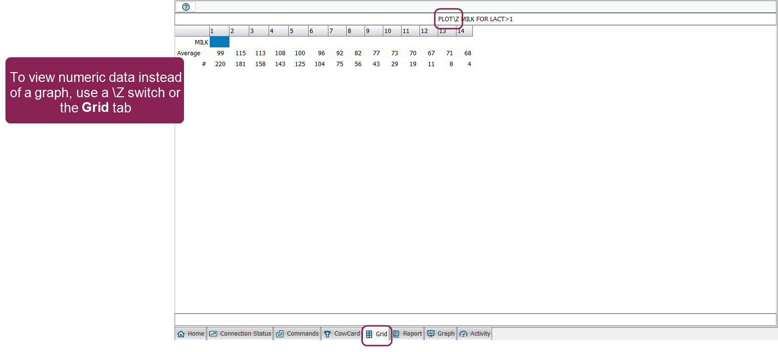 You can use the \Z switch to show raw data tables instead of a graph (or simply click the Grid tab). These tables list the average values and the animal count (the number of animals included in that average) for each test day. This is often used for in-depth analysis where you need to see the specific numbers behind the curves.