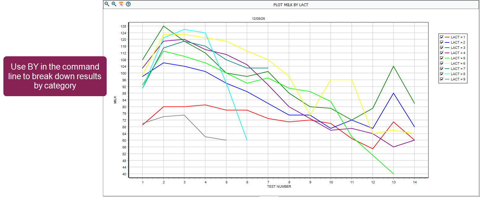 To break down results by category, add a BY statement. For example, PLOT MILK BY LACT displays multiple curves for each lactation group on one graph. You can also group by other items like cow breed or test day pen (e.g., TPEN).