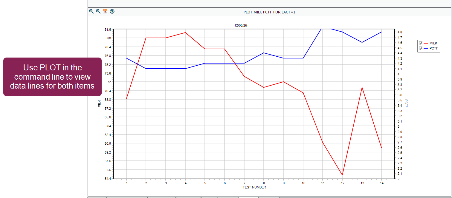 An example PLOT graph is shown below, illustrating how the function displays test day data for an individual animal. In the example, MILK and PCTF were selected.