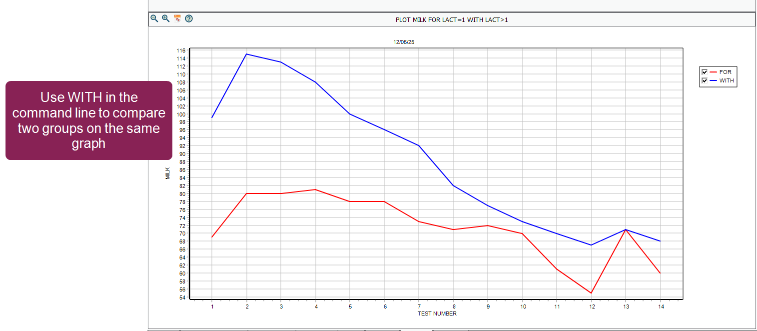 To compare two groups on the same graph, add a WITH statement. For example, PLOT MILK FOR LACT=1 WITH LACT>1 plots first-lactation animals and overlays mature animals on the same graph: