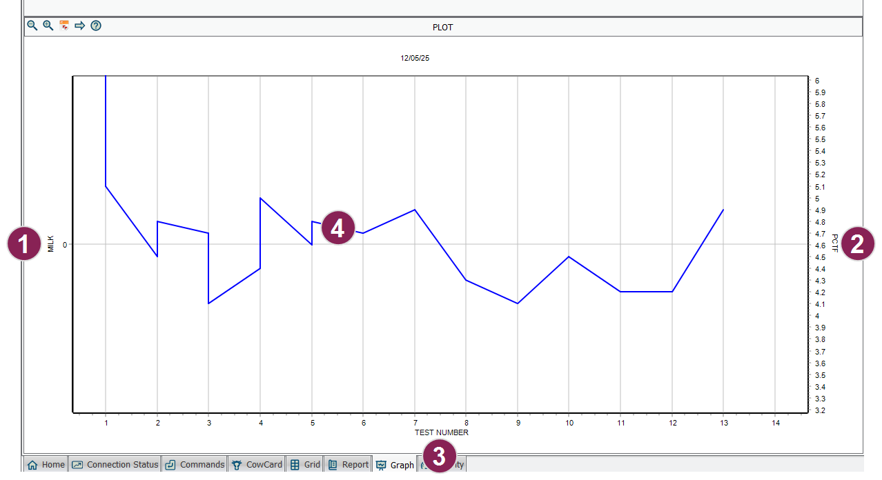 By default, PLOT groups data by test number (Test 1, Test 2, etc.). In this mode, the graph only includes active animals and their current lactation data.