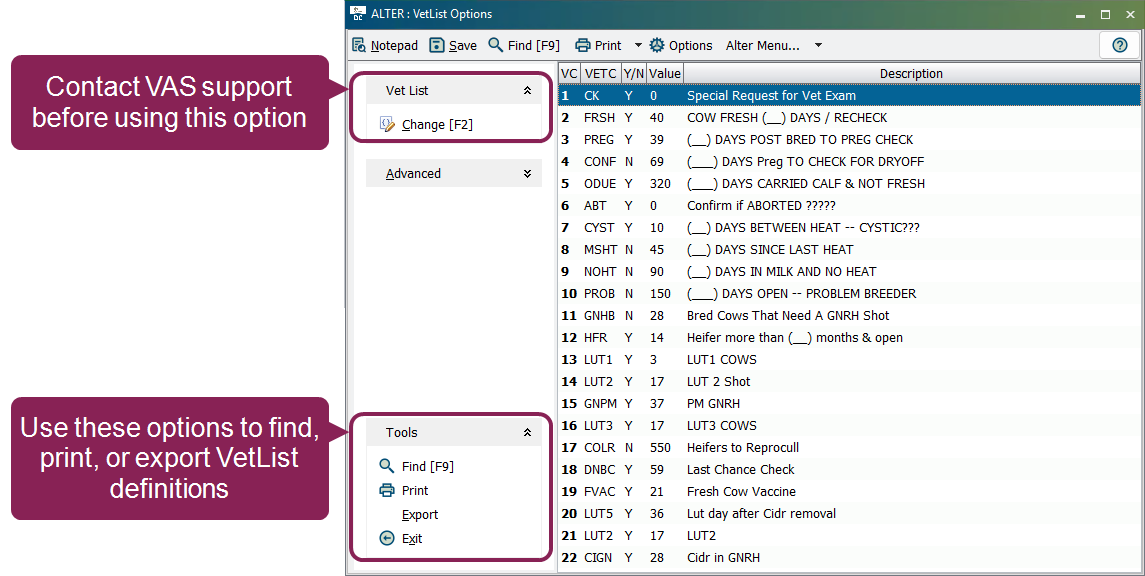 The system displays the numbers, names, values, and descriptions of all VetList options in the current table. You can either print the list from the browser or export the information to a file.