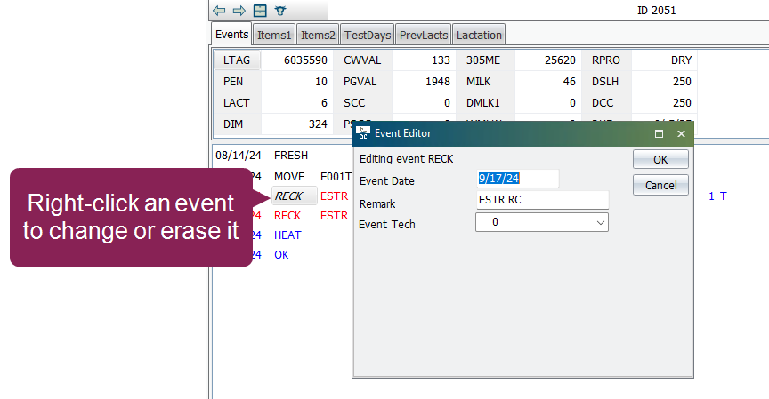 To manage an individual event directly on the CowCard, you can right-click it to either Change This Event or Erase This Event. This is the primary method for correcting a single event entry. You can also double-click on an event to change it.